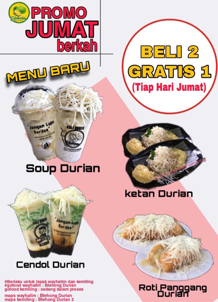 Waktu operasional Kedai Blehong Durian buka dari pukul 10.00 – 23.00 WIB. Satu hal lagi yang buat menarik dari kedai Blehong Durian yaitu setiap hari Jumat akan ada Promo Jum’at Berkah yaitu promo ini beli 2 gratis 1. Promo ini sudah berjalan dari bulan Mei 2020 hingga artikel ini ditulis pun juga masih berlaku, gimana tertarik?