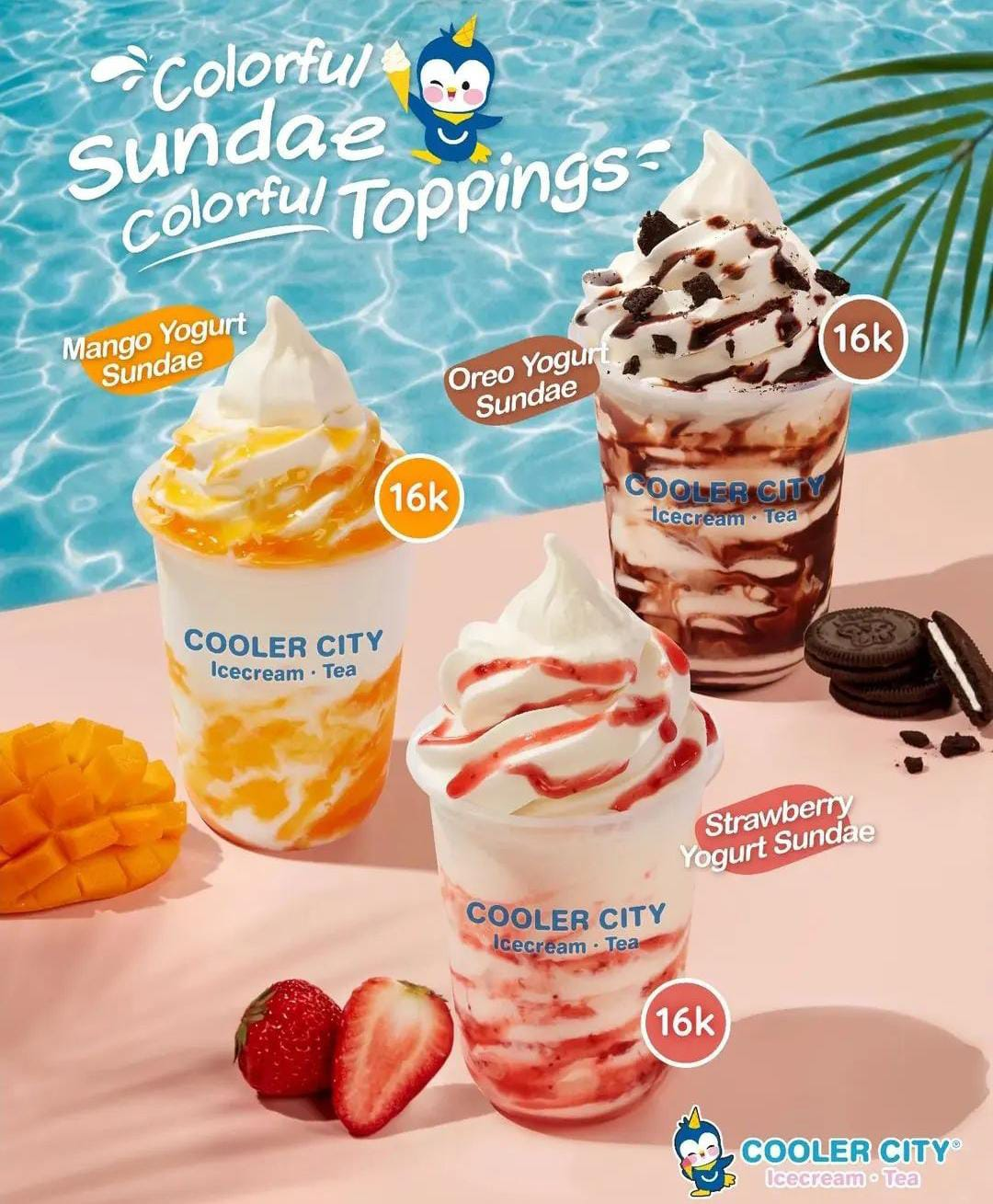 Disini menu yang dijual start from Rp. 8.000 aja, kamu sudah bisa menikmati ice cone yang nyegerin dengan rasa yang unik yaitu vanilla, matcha, dan strawberry. Cooler City menjual banyak varian ice cream seperti series sundae dengan rasa Mangga, Strawberry, dan coklat. Menu minuman lainnya yang dijual juga disini seperti lemonade, milk tea, fruit tea dengan berbagai varian.