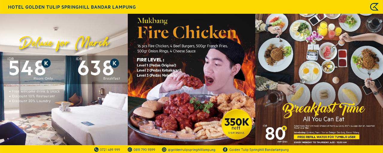 Bandar Lampung – Dalam memilih hotel untuk menginap, tentu ada banyak sekali pertimbangan. Mulai dari harga, fasilitas, hingga pelayananan. Maka dari itu Hotel Golden Tulip Springhill Lampung sebagai hotel favorit wisatawan Lampung selalu memberikan promo yang memanjakan para tamu, mulai dari promo kamar, promo mukbang fire chicken hingga promo all you can eat breakfast.