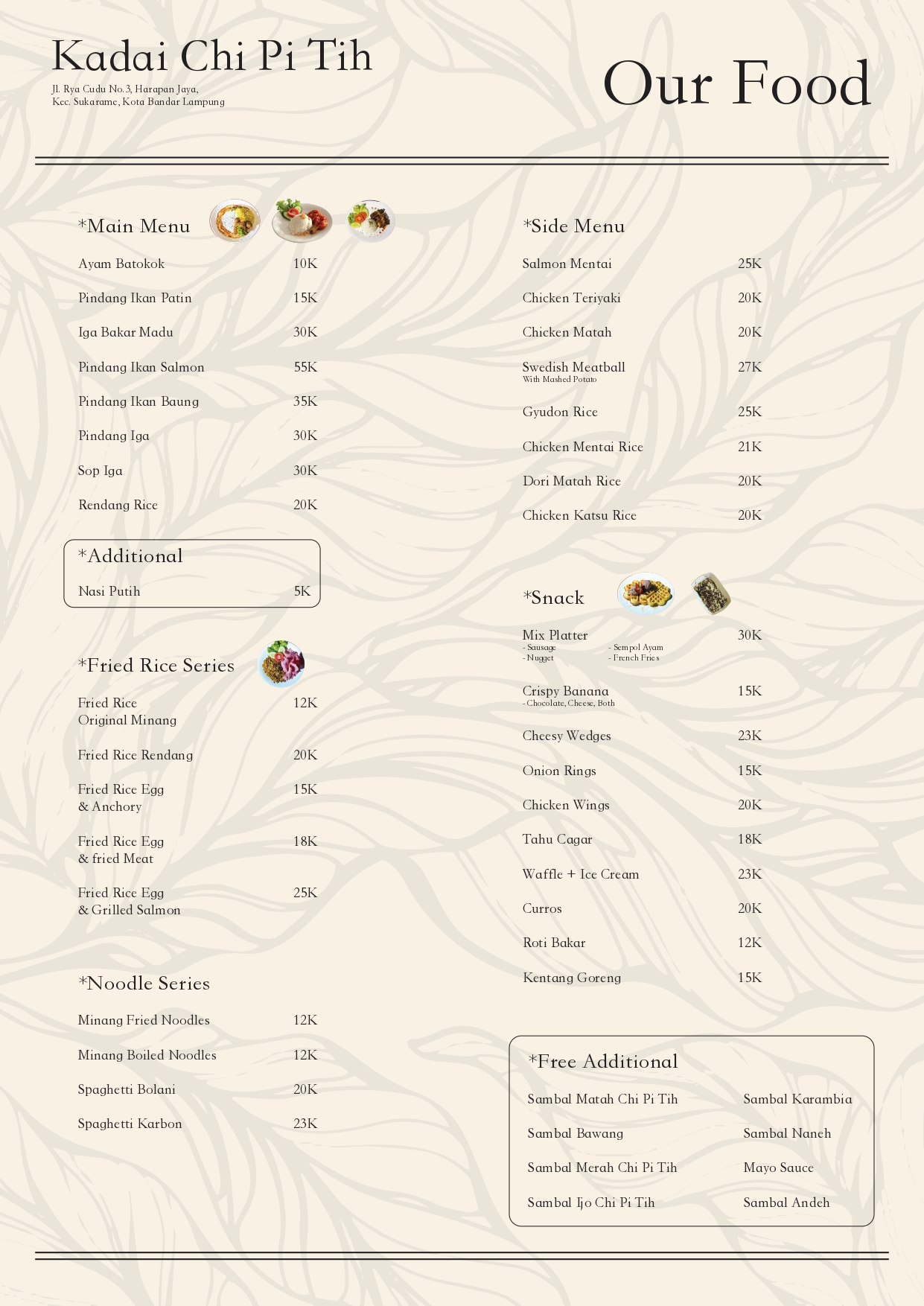 Beralih ke bagian menu yang ditawarkan di sini berbagai sajian makanan (ringan/berat), minuman, dan juga snack tersedia dengan varian beraneka ragam. Pengunjung tak perlu merogoh kocek yang terlalu mahal untuk bisa menikmati hidangan di sini, hanya bermodalkan Rp 12.000 saja sudah bisa nyobain kulineran di Kadai Chipitih. Sesuai dengan konsep ialah khas makanan dari daerah Padang sekaligus kolaborasi dengan makanan kekinian, jadi pengunjung bisa memilih keduanya di lokasi ini. Menu favorit di Kadai Chipitih yakni nasi goreng (teri/daging), ayam batoko, nasi ayam iga bakar, pindang (salmon/patin) itu yang bagian menu utama, sedangkan untuk menu sampingnya di sini ada swedish meatball, nasi dori matah, ayam matah, nasi ayam mentai. Selain kedua menu utama dan samping, tersedia juga snack favorit di Kadai Chipitih ialah mix platter berupa saus, nugget, sosis, sempol ayam dan kentang. Untuk di bagian minuman. Di menu sarapan di sini menyediakan ketupak dan soto padang