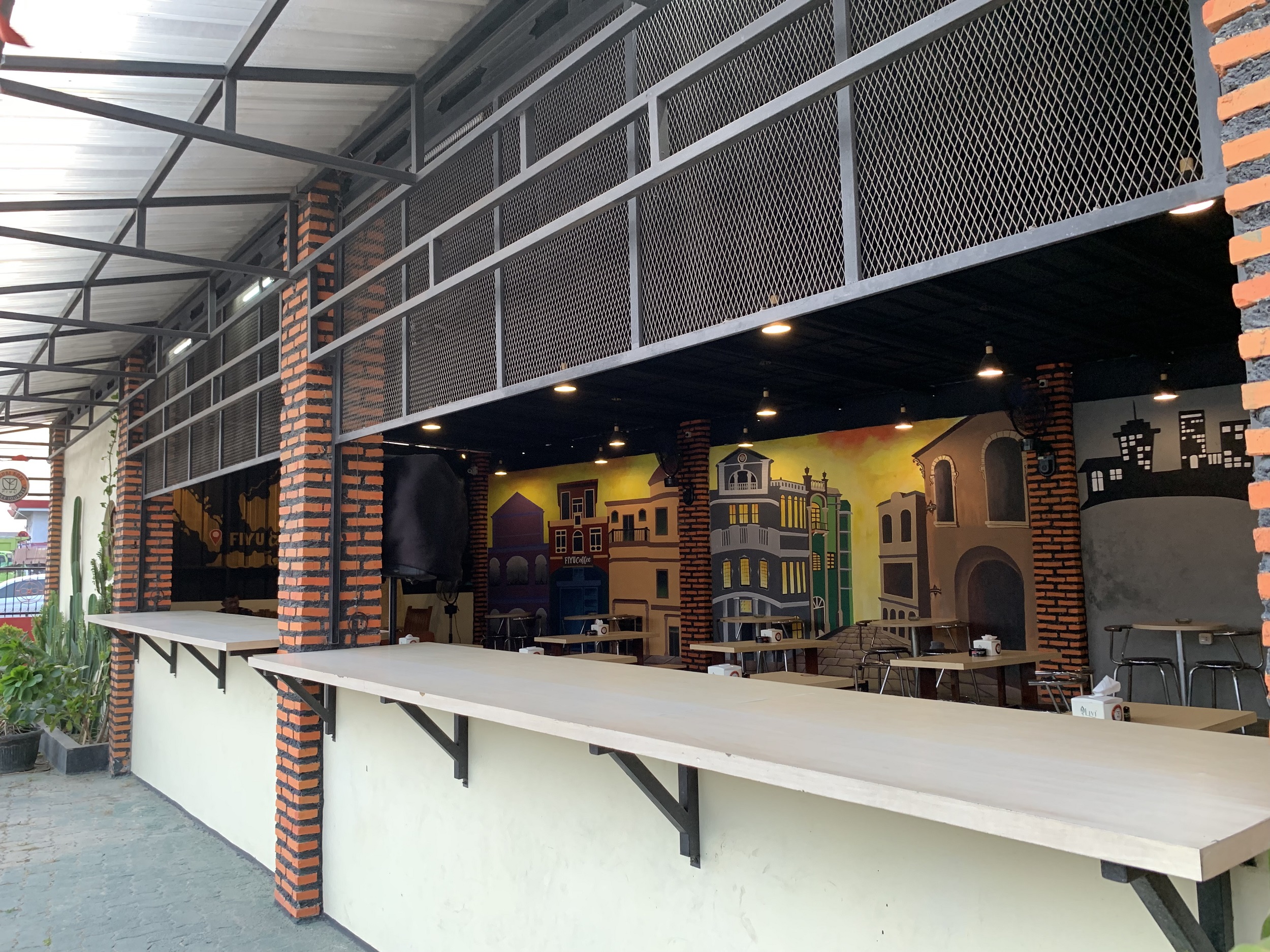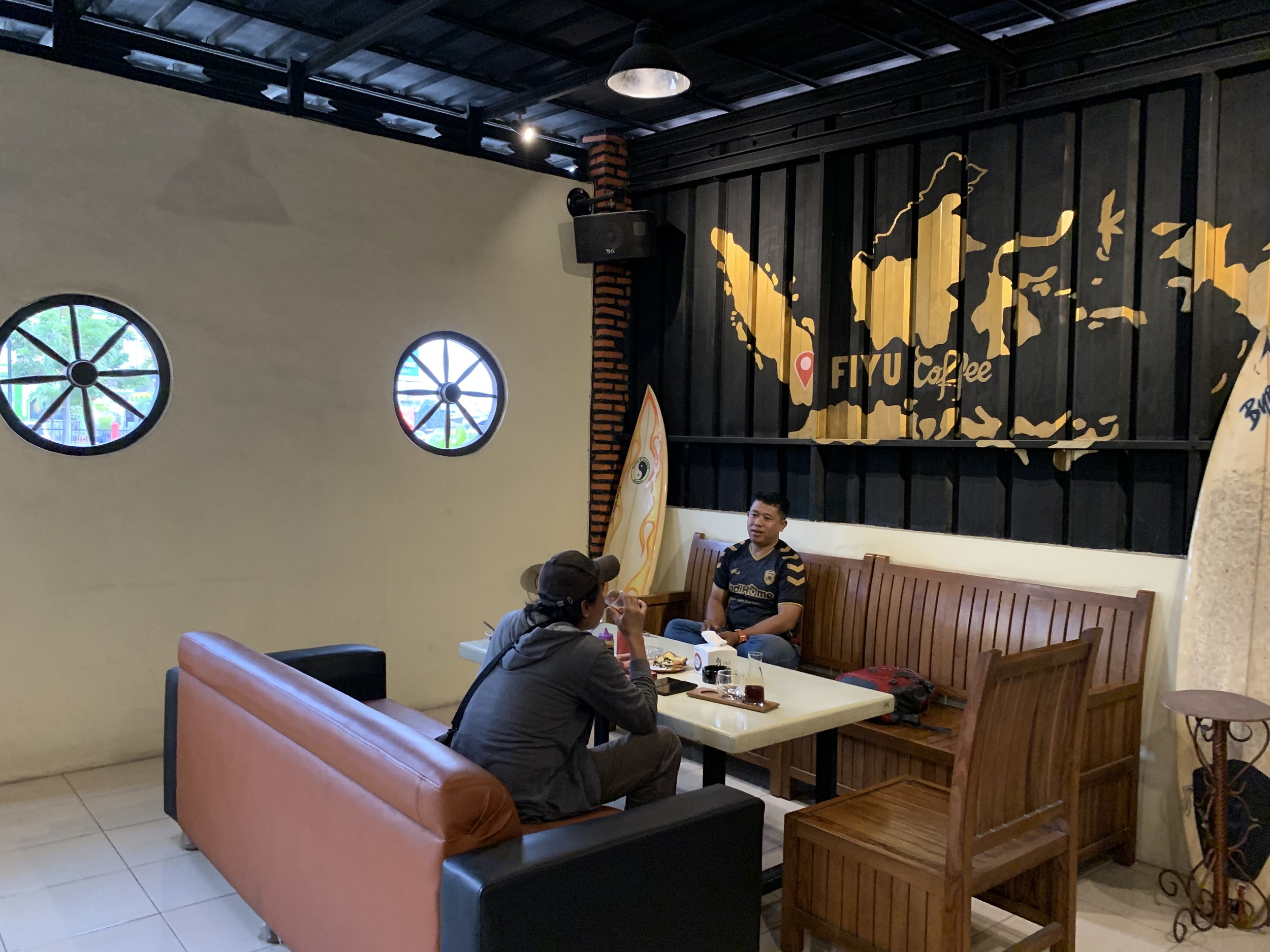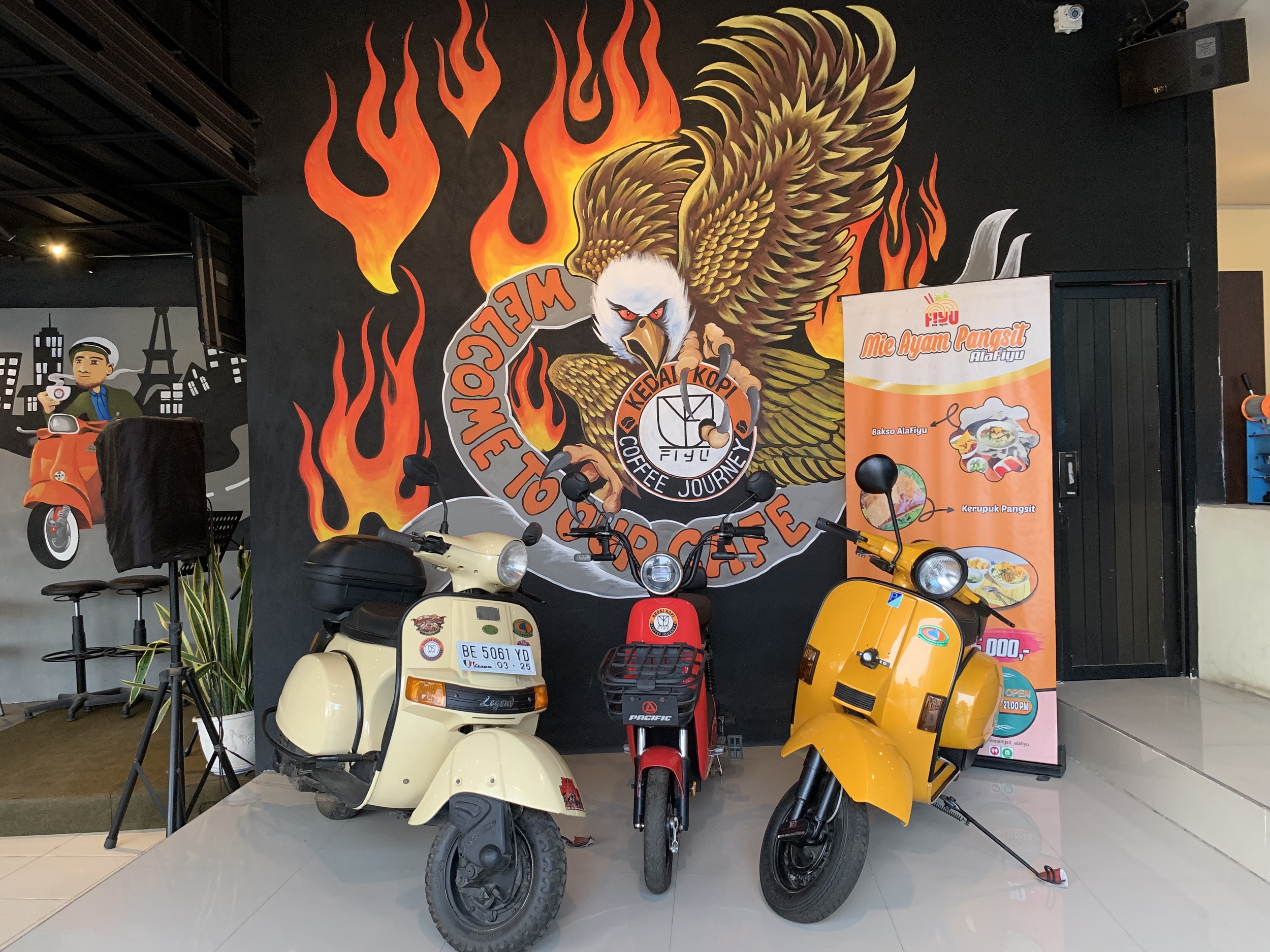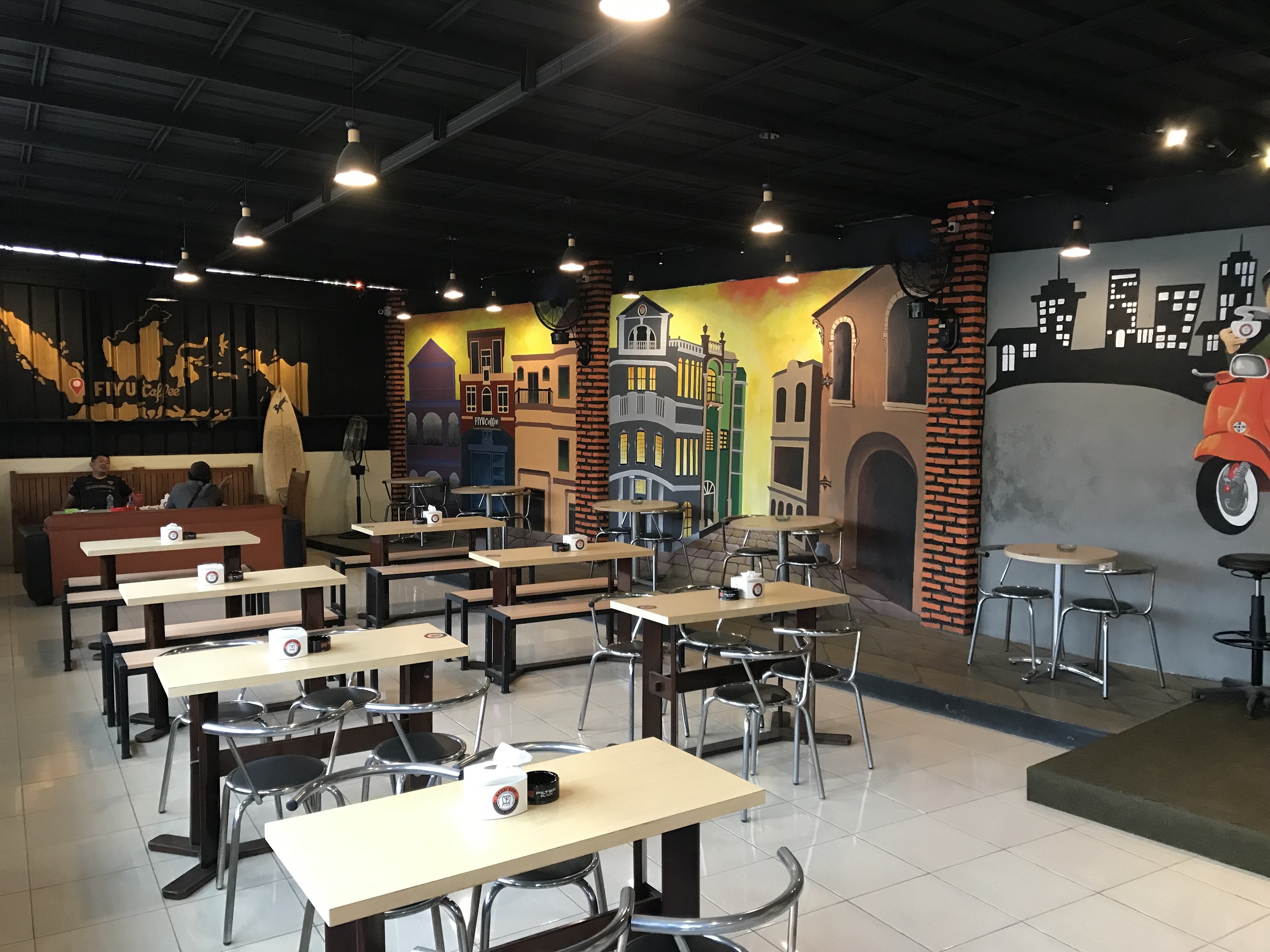 Mengusung konsep ala bikers motor, Kedai Kopi Fiyu menampilkan secara langsung motor sungguhan yang diperuntukan sebagai ornamen dan tempat berfoto. Selain motor sungguhan, yang menarik disini ialah lukisan dindingnya dengan model 3 dimensi bergambar jalanan, gedung-gedung dan bikers motor yang sedang melakukan kegiatan touring.