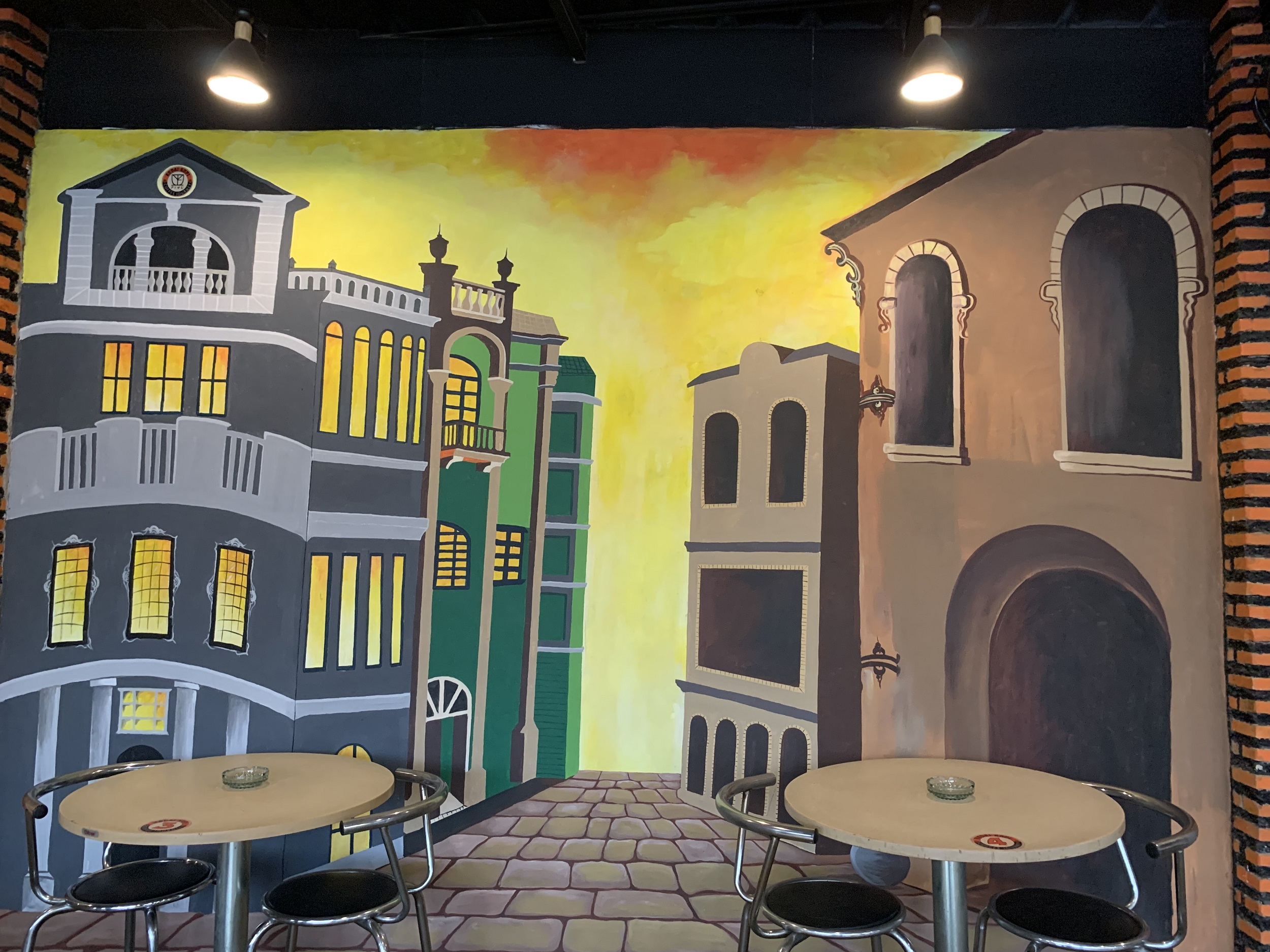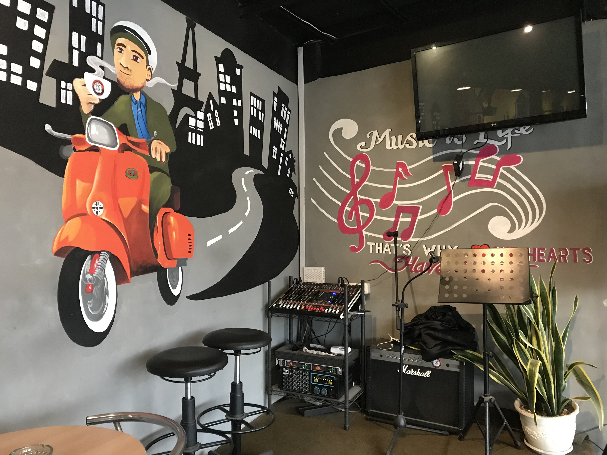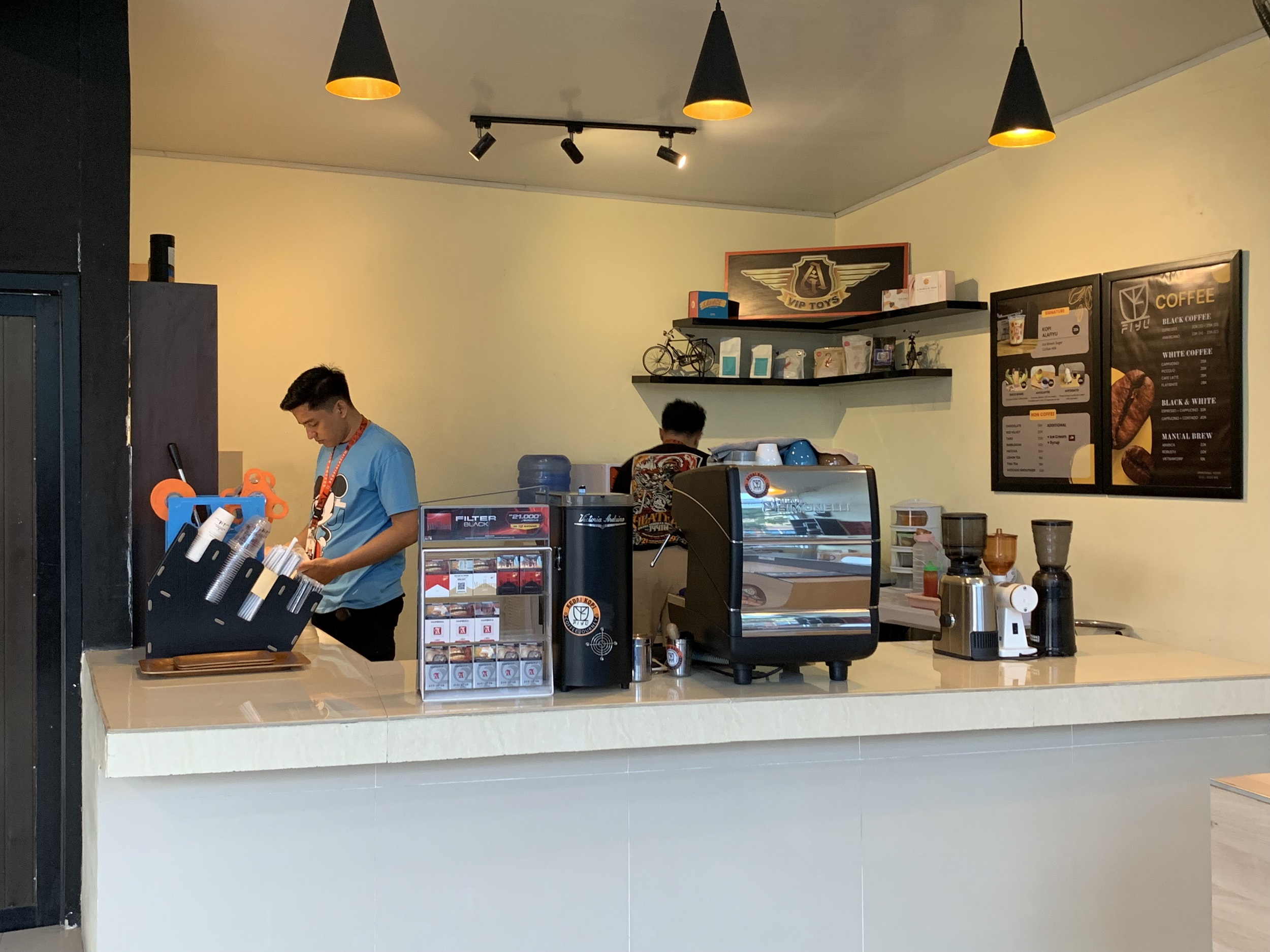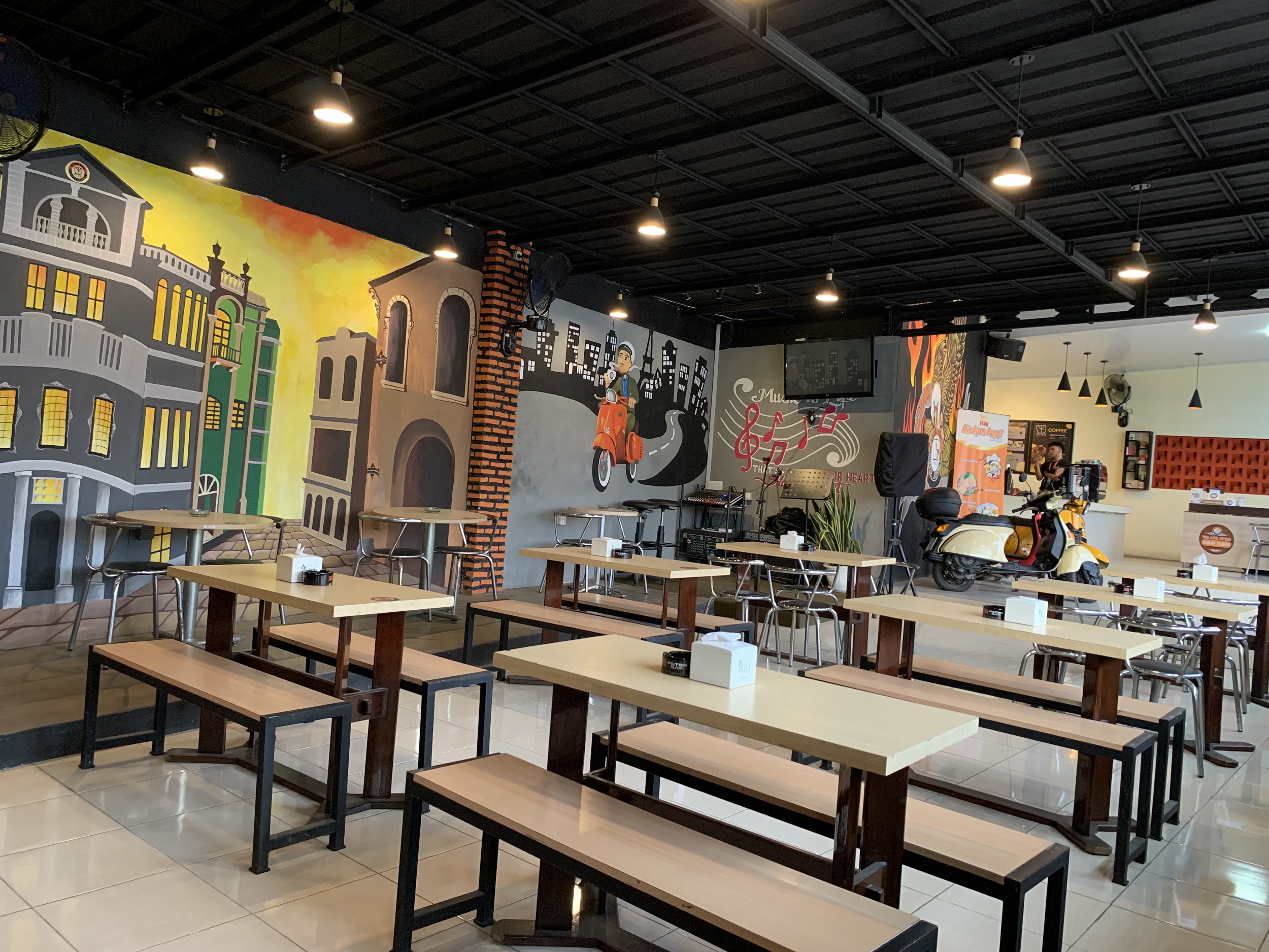 Mengusung konsep ala bikers motor, Kedai Kopi Fiyu menampilkan secara langsung motor sungguhan yang diperuntukan sebagai ornamen dan tempat berfoto. Selain motor sungguhan, yang menarik disini ialah lukisan dindingnya dengan model 3 dimensi bergambar jalanan, gedung-gedung dan bikers motor yang sedang melakukan kegiatan touring.