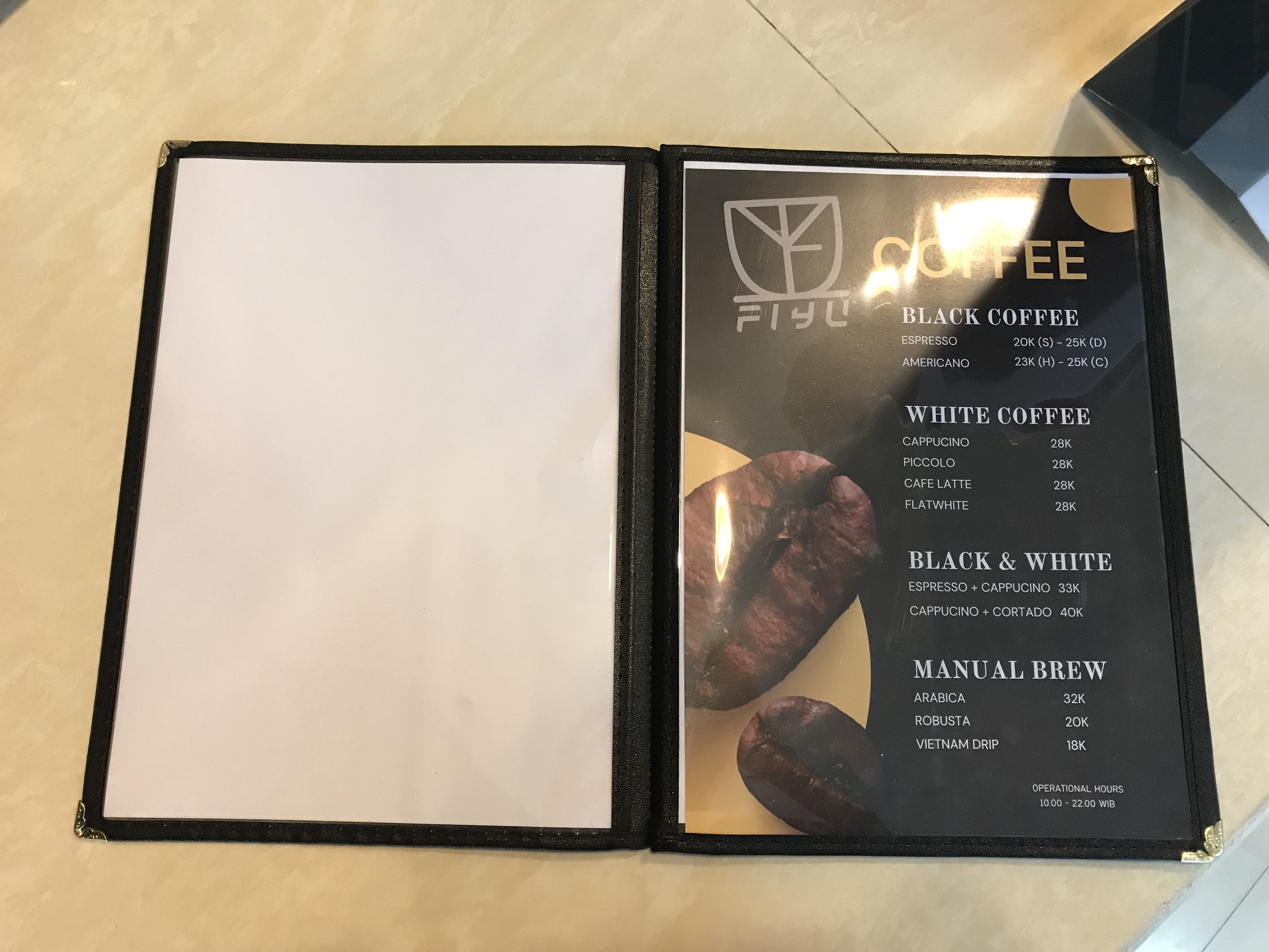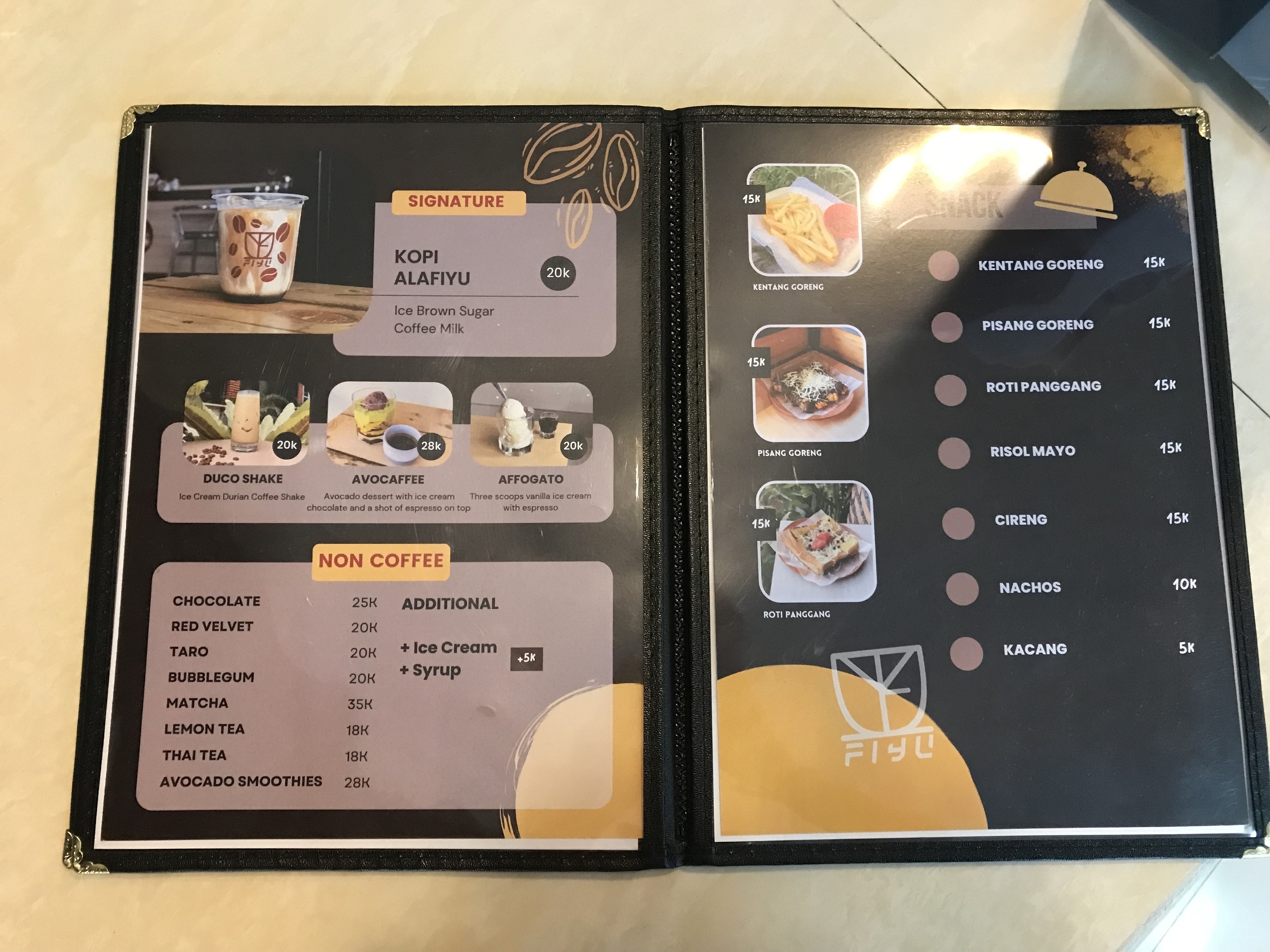 Menu yang tersedia di kedai Kopi Fiyu ini terdiri dari snack, makanan ringan dan aneka minuman kopi maupun non kopi. Menu minuman kopinya antara lain espresso, americano, cappuccino, cafe latte, piccolo kemudian sajian signature ada kopi alafiyu, duco shake, avocaffee, affogate serta beberapa pilihan non coffee.