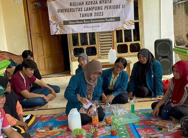 Lampung Tengah – Mahasiswa Universitas Lampung yang melaksanakan kegiatan Kuliah Kerja Nyata (KKN) di Desa Restu Baru, Rumbia, Lampung Tengah, menggelar serangkaian kegiatan yang mengedepankan aspek pelestarian lingkungan. Kegiatan tersebut terdiri dari penanaman 300 bibit pohon dan pelatihan pembuatan pupuk organik cair (POC) dari limbah dapur rumah tangga.