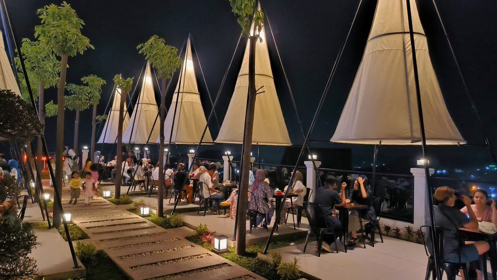 Tak kalah cantik dan bener-bener the best banget, adalah saat langit udah gelap malam hari. Gemerlap cahaya kota Bandar Lampung di malam hari jadi view utama yang terlihat dari atas sini, lampu dari rumah-rumah warga serta cahaya bulan mempercantik dinner kamu disini.