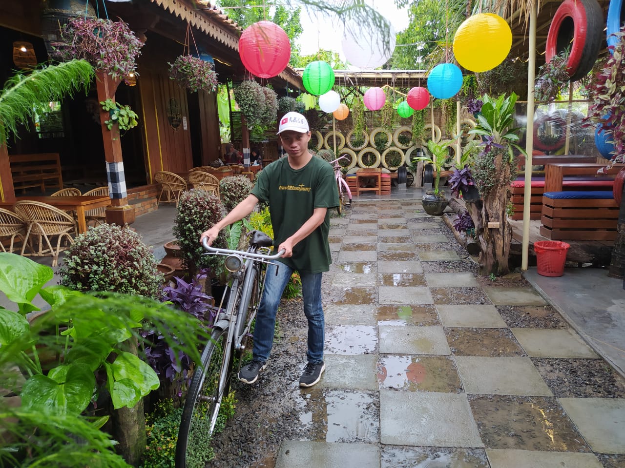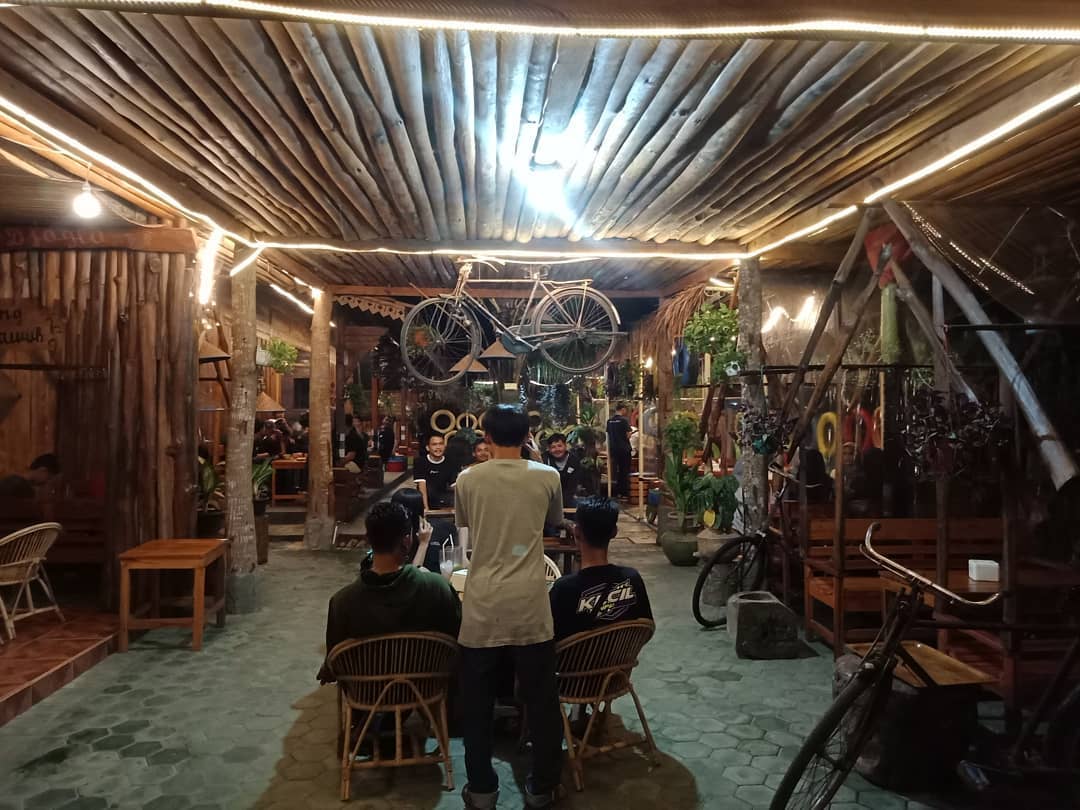 Dengan tema kecoklatan khas Rumah Djoglo dipadukan dengan tanaman hias gantung serta ban-ban bekas yang dicat rapi, membuat tempat ini terlihat cantik dan menarik. Wajar saja banyak orang datang ke sini, selain karena tempatnya yang bernuansa vintage juga suasana tempatnya tenang dan nyaman.